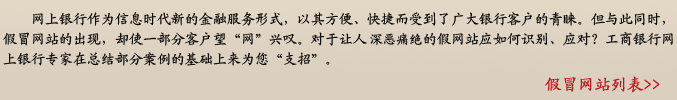 建議客戶在登錄我行網上銀行或進行在線支付時,留意覈對所登錄的網址與我行公佈的網址是否相符,謹防不法分子惡意模仿我行網站,騙取客戶信息。我行個人網上銀行登錄頁面和在線支付頁面的網址均以https://mybank.icbc.com.cn開頭。