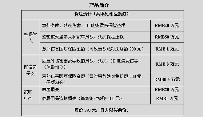 本產品爲個人綜合險,保障範圍廣泛,既保意外,又保家庭財產;