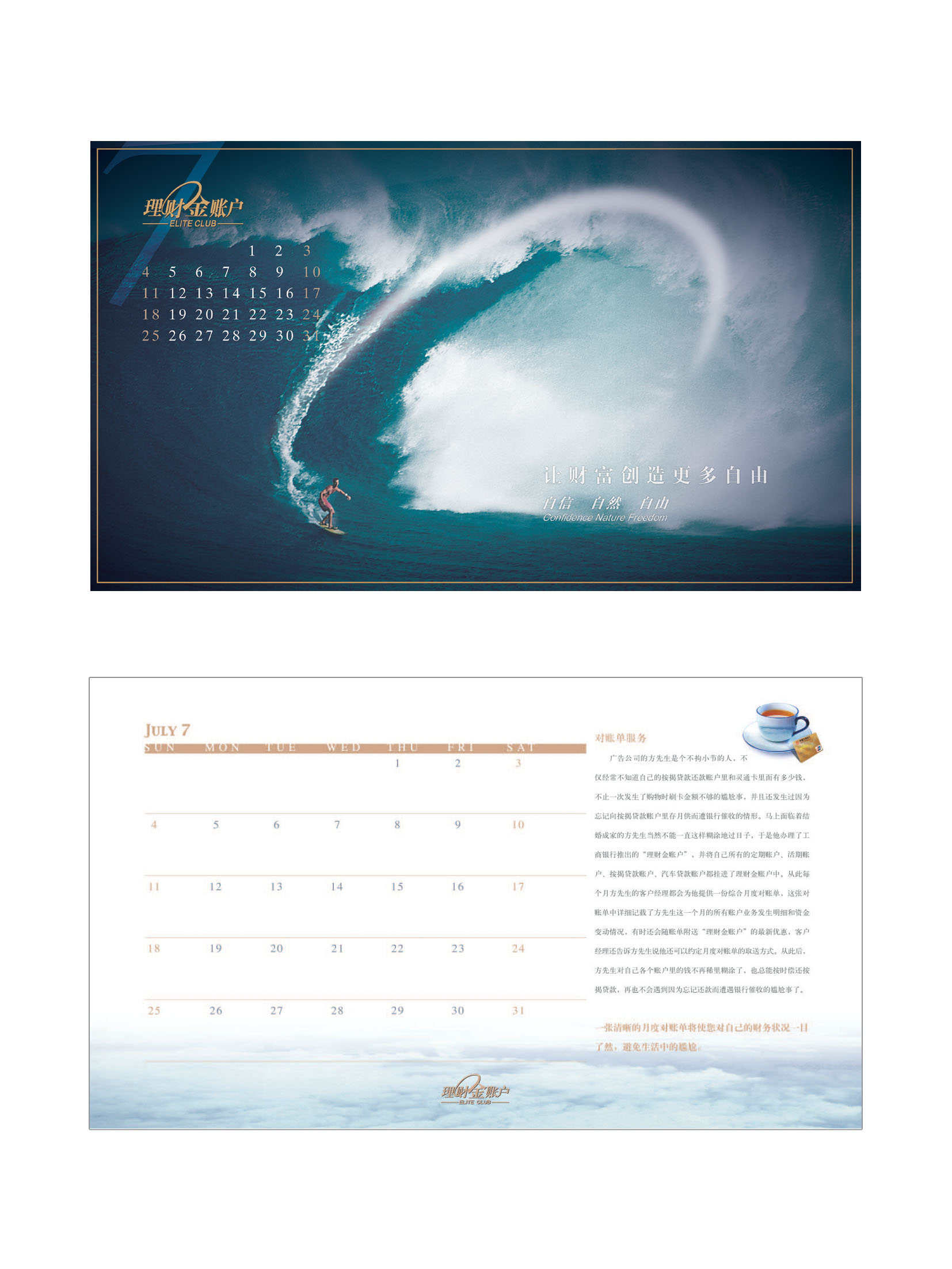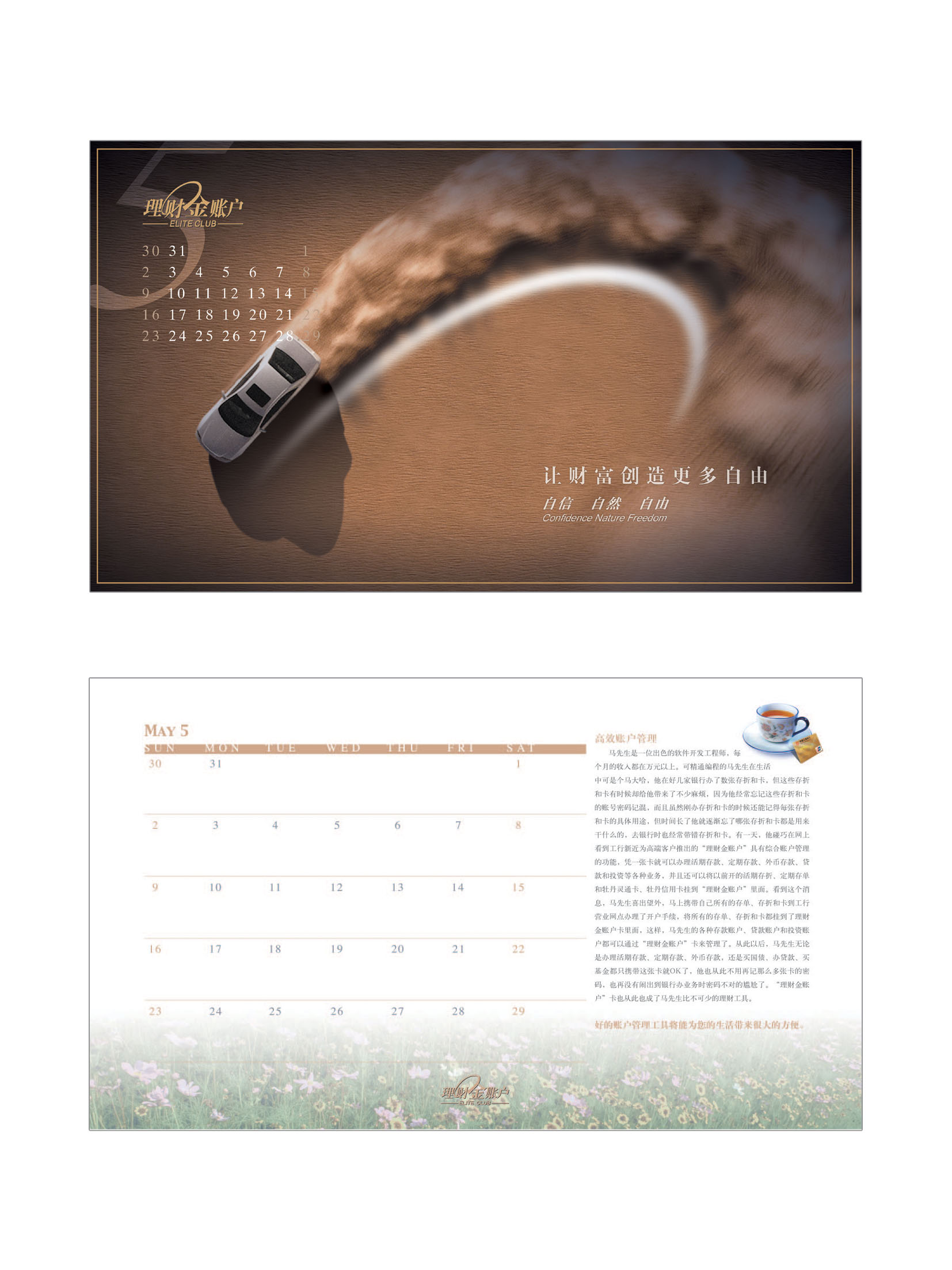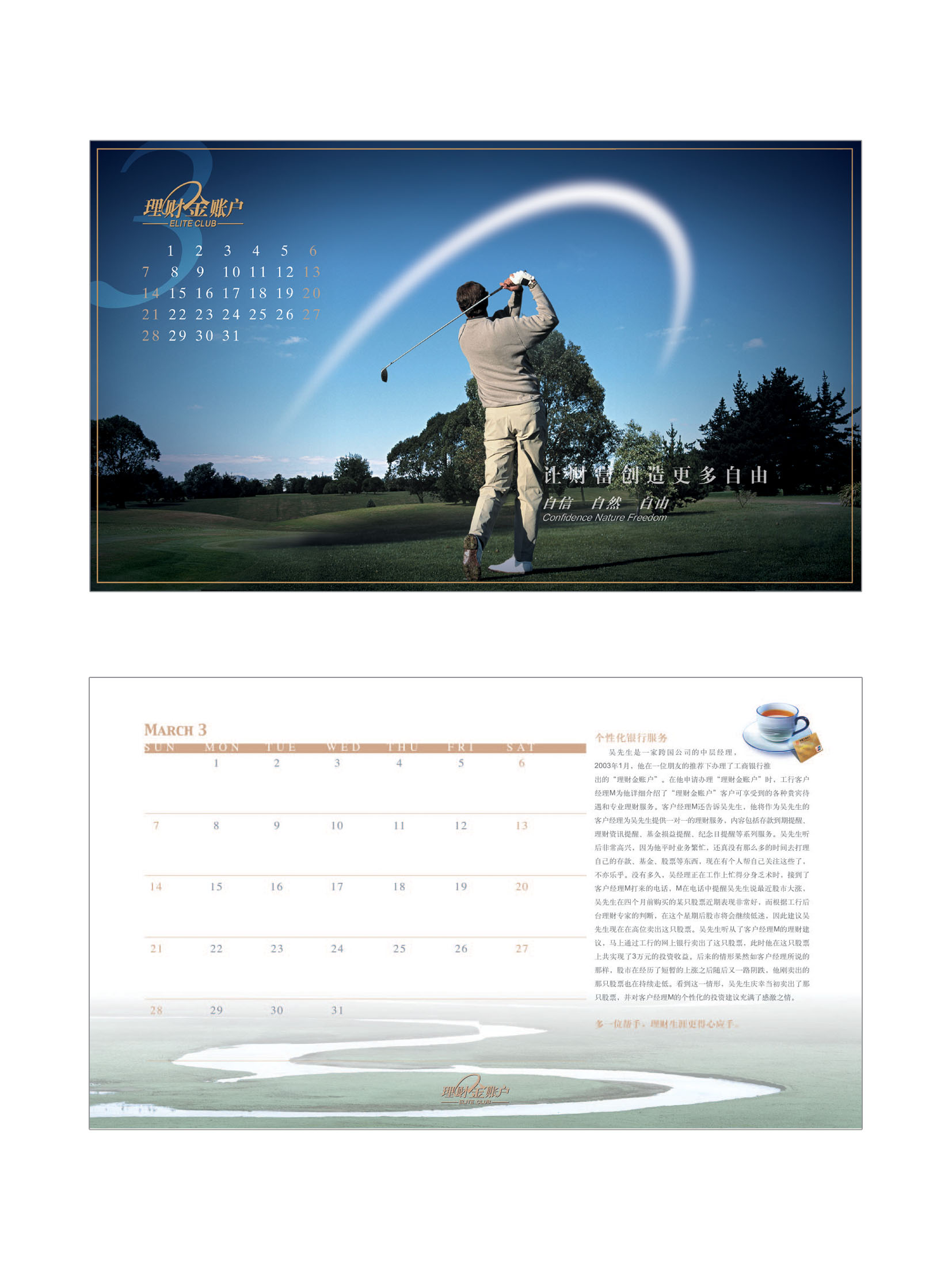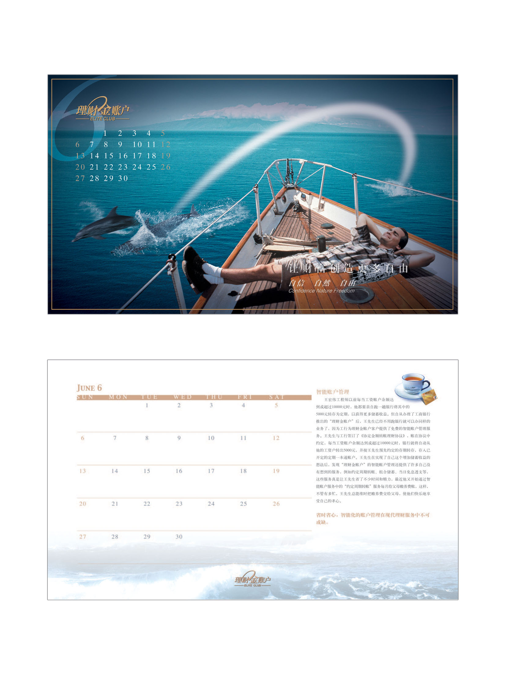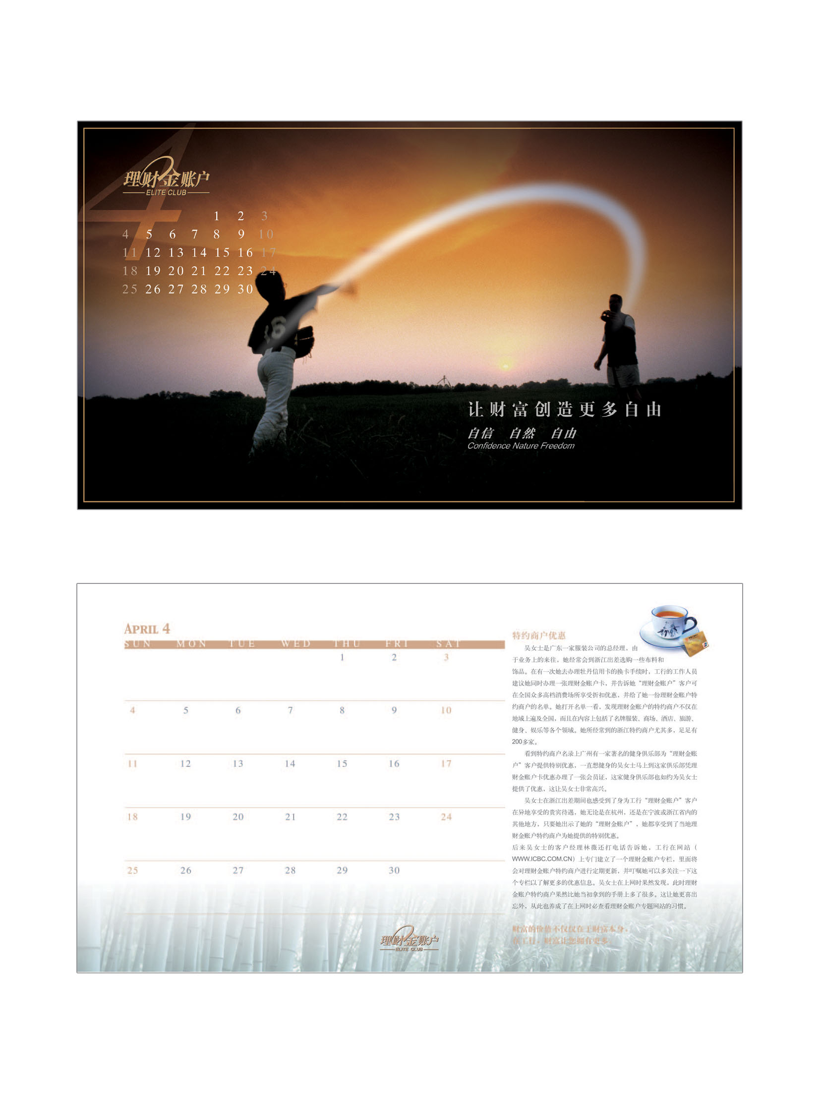 理財金賬戶2004年臺歷通過講述12個現實生活中普通人的理財體驗,深入淺出的介紹了理財金賬戶能爲您帶來的“綠色通道優先服務”、“貴賓專享優惠”、“個性化銀行服務”、“特約商戶優惠”、“高效賬戶管理”、“智能賬戶管理”、“對賬單服務”、“理財規劃”、“投資服務”、“環球理財服務”、“融資貸款服務”、“電子銀行理財”等一系列專屬服務,幫助您更加靈活自如的應用理財金賬戶的諸多功能,享受財富帶來的更多自由!