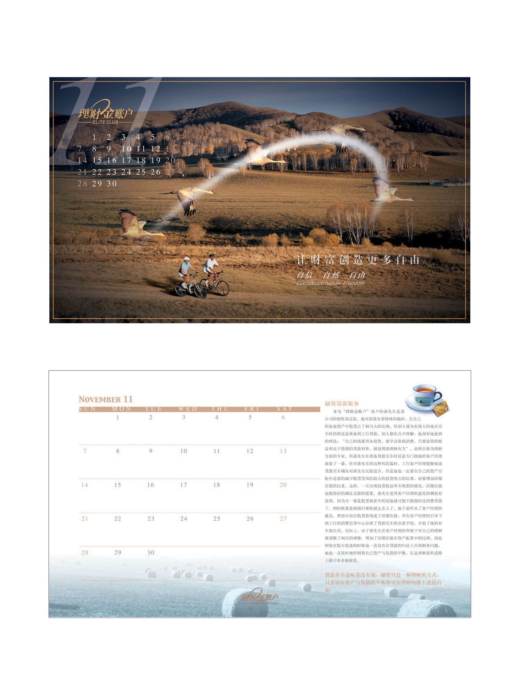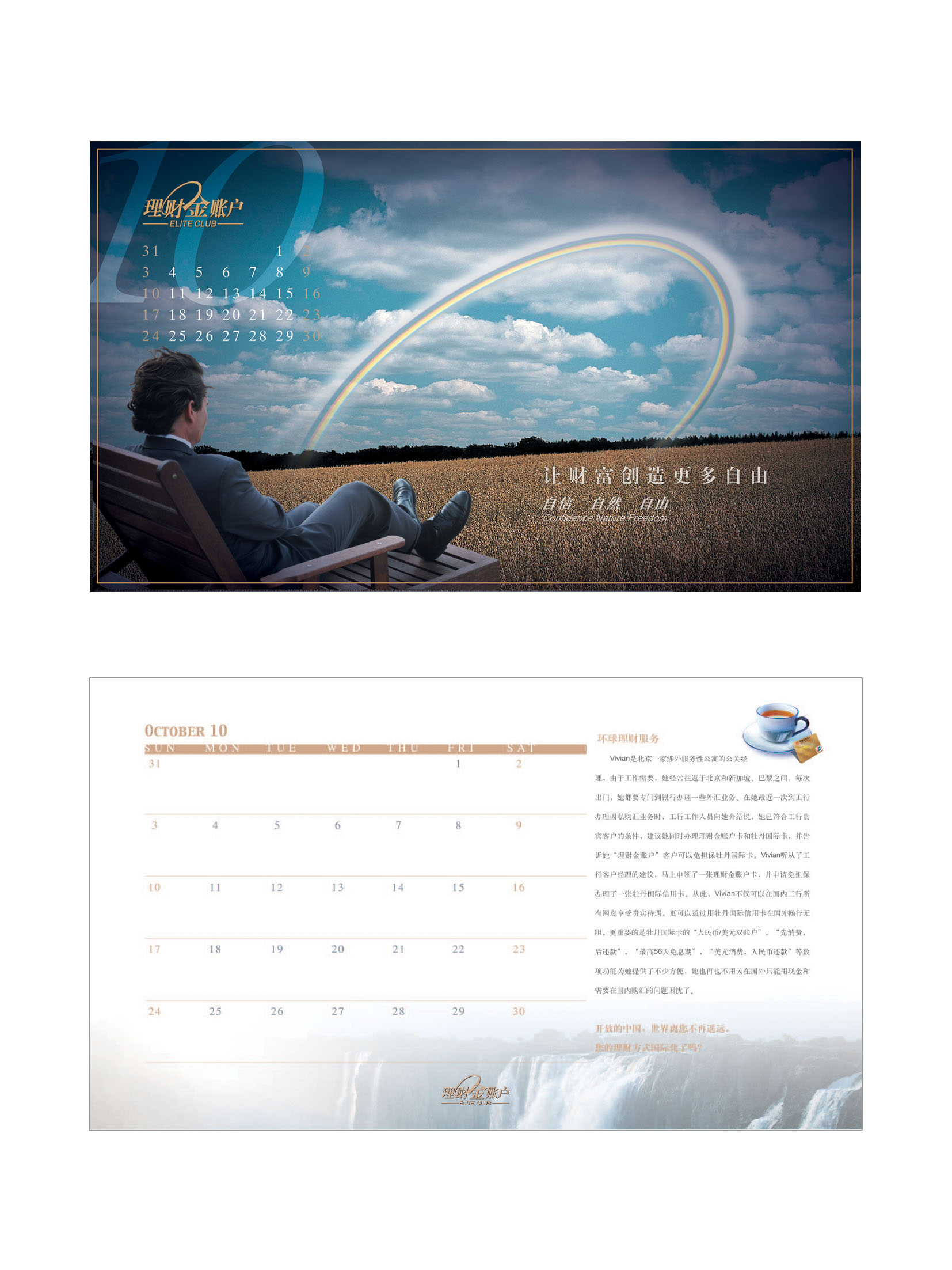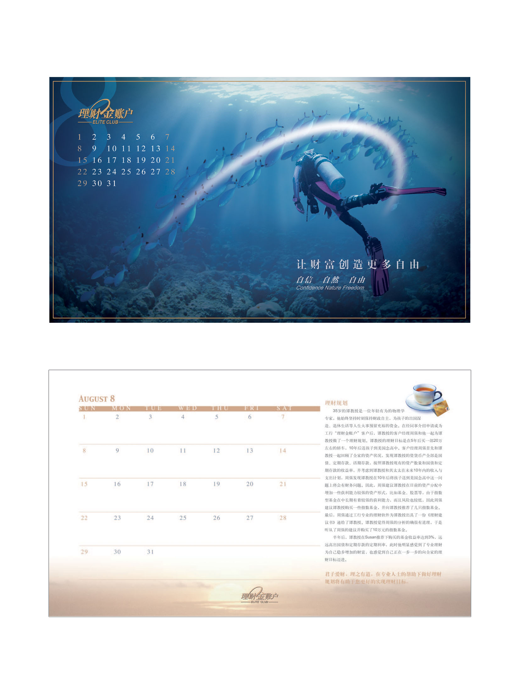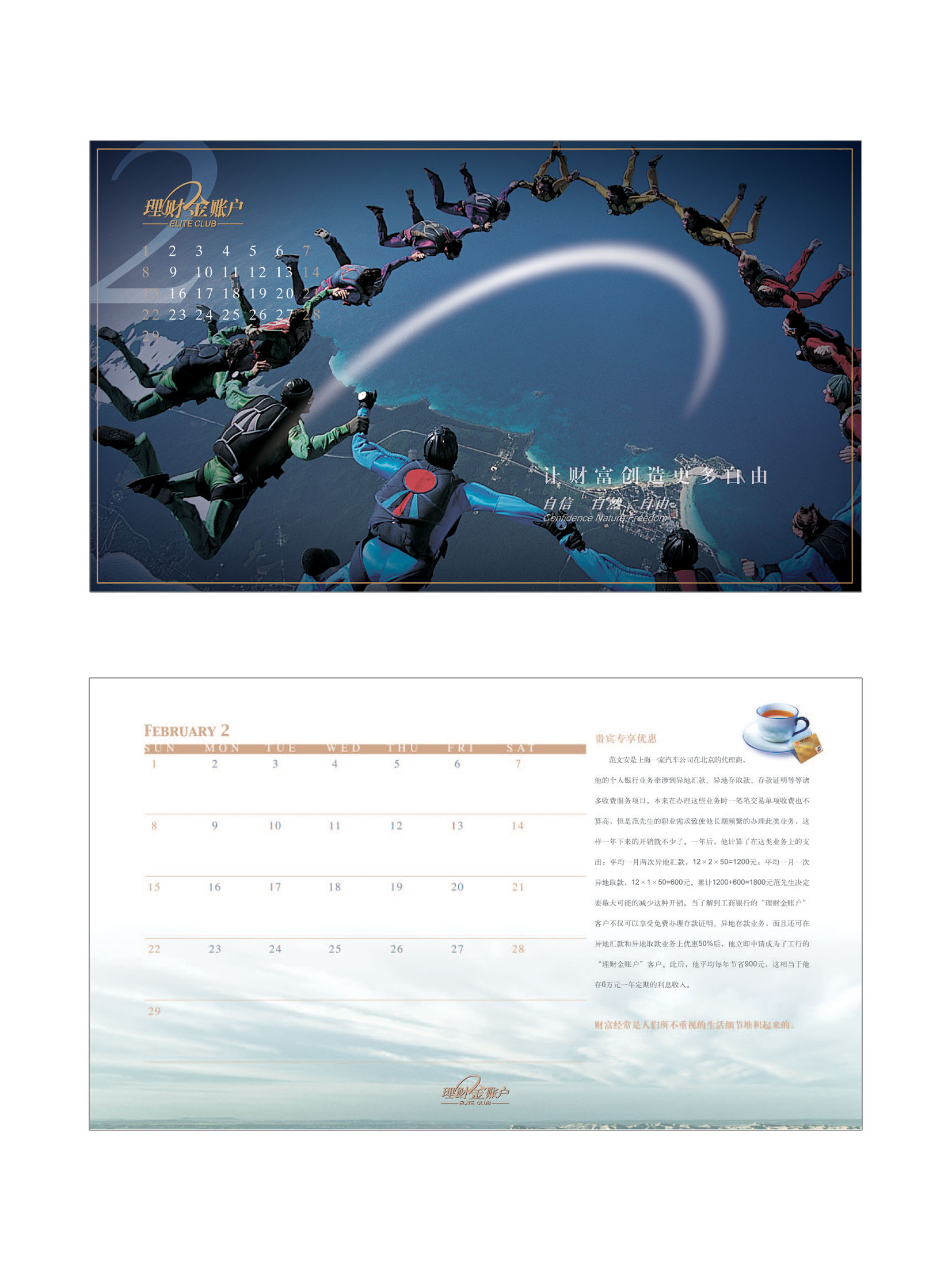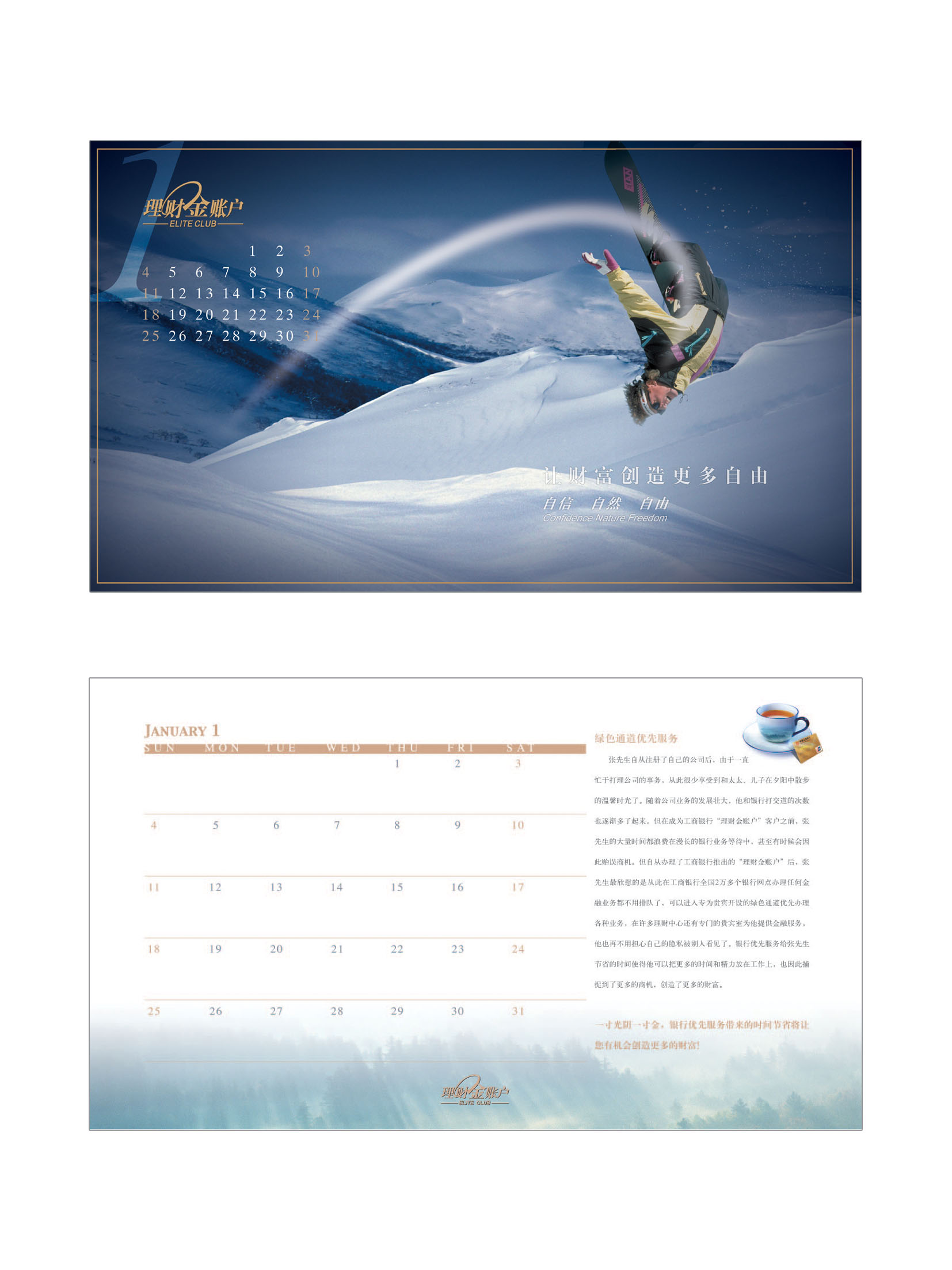 理財金賬戶2004年臺歷通過講述12個現實生活中普通人的理財體驗,深入淺出的介紹了理財金賬戶能爲您帶來的“綠色通道優先服務”、“貴賓專享優惠”、“個性化銀行服務”、“特約商戶優惠”、“高效賬戶管理”、“智能賬戶管理”、“對賬單服務”、“理財規劃”、“投資服務”、“環球理財服務”、“融資貸款服務”、“電子銀行理財”等一系列專屬服務,幫助您更加靈活自如的應用理財金賬戶的諸多功能,享受財富帶來的更多自由!