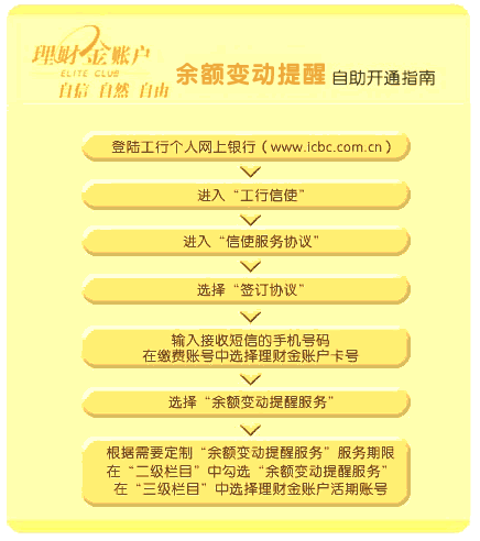 您只需登陸“金融 @ 家”個人網上銀行,進入“工行信使”欄目輸入手機號碼即可輕鬆開通,您還可根據需要更改手機號碼、取消餘額變動提醒服務或延長服務期限。