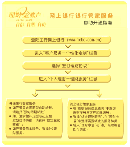 3、如果您辦理了工行網上銀行證書版,您還可以在網上銀行的“個人理財-理財服務”欄目中選擇相應服務種類自助開通或終止銀行管家服務項下的備用金服務、固定週期型自動轉賬、餘額補足型自動轉賬、起點觸發型自動轉賬。銀行管家服務自助開通步驟見下圖。